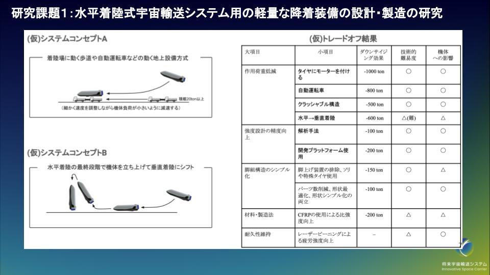- 採択は、水平着陸式宇宙輸送システム用の「軽量な降着装備」並びに「軽量な機体」の設計・製造に関する研究