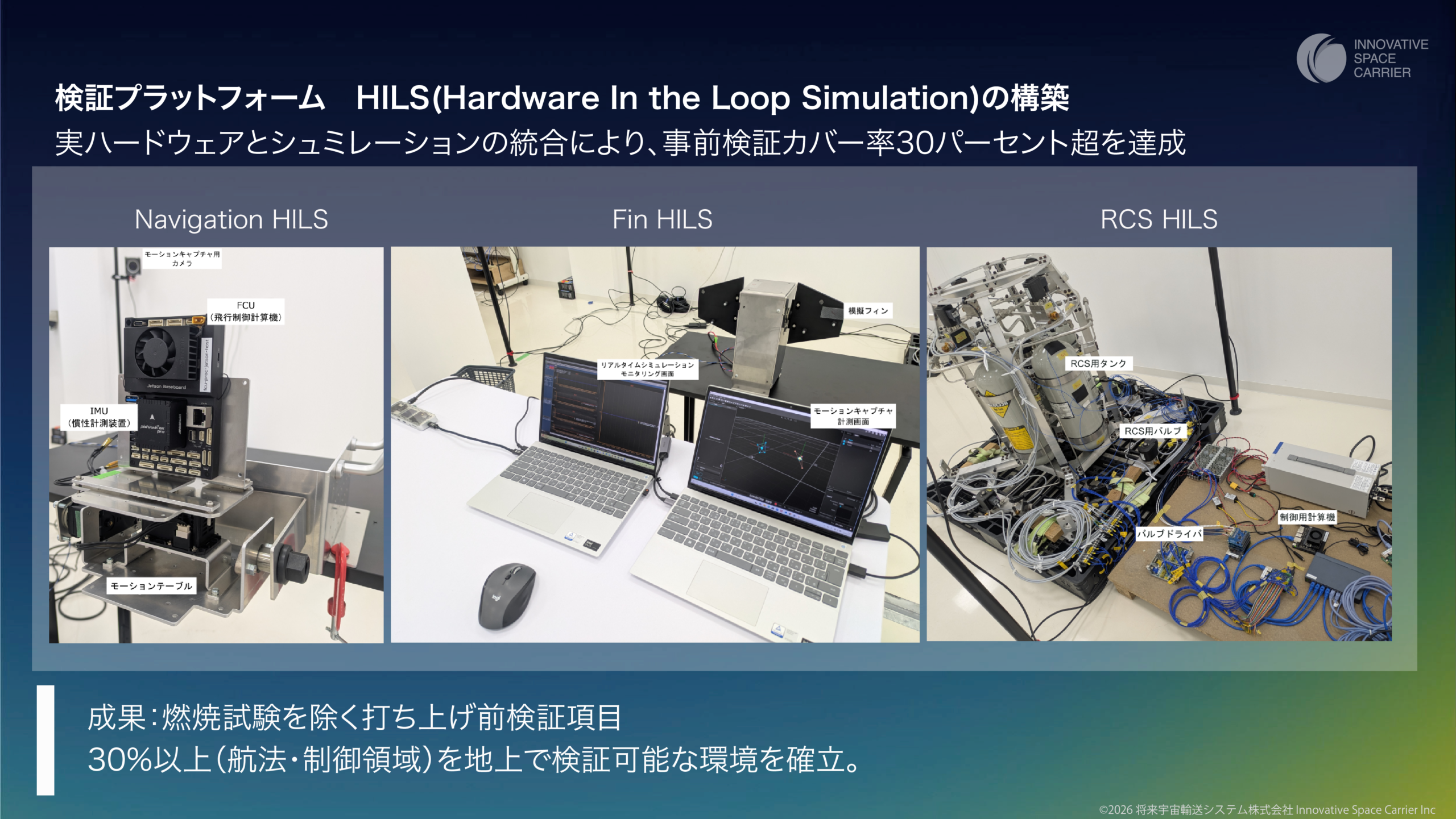 初年度(2025年度)は、機体の姿勢制御を担うRCS(ガス噴射制御)、プラナーフィン、および姿勢推定の3種類に対応するHILS環境の構築を完了しました。これにより、地上でのシミュレーションによる検証カバー率は、当初目標の30%を上回る45%に達しています。
